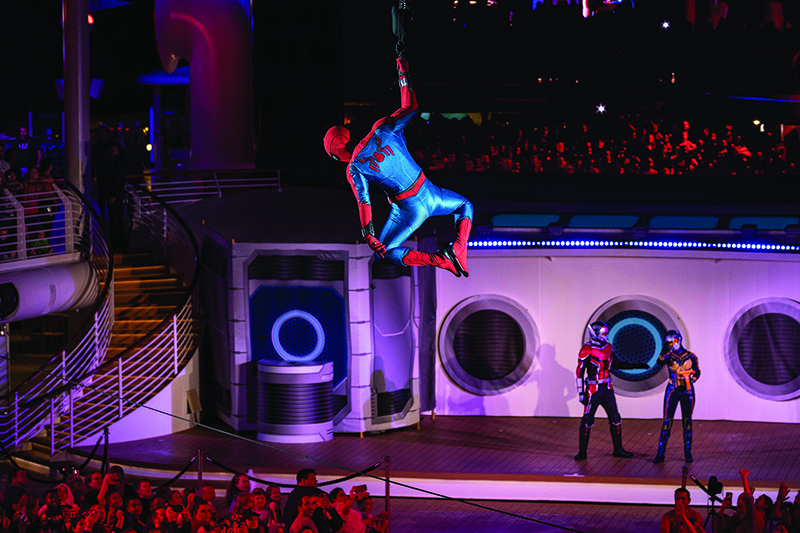 Disney Cruise Line guests will be transported to a new realm of possibilities when the Marvel Universe assembles aboard Marvel Day at Sea sailings in 2024. During the signature nighttime spectacular “Heroes Unite,” Marvel Super Heroes and Villains take part in an action-packed battle featuring special effects, stunts and pyrotechnics. (Matt Stroshane, photographer)